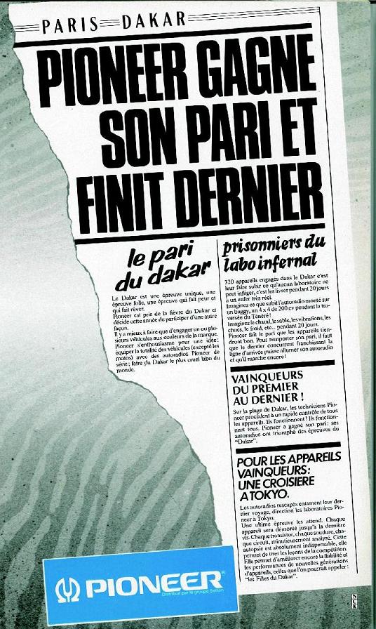 Une publicité Pioneer en double page où l'on apprend que les participants du Dakar se sont vu proposer le montage d'un autoradio gratuitement pour faire des essais d'endurance en milieu hostile ...